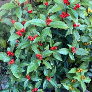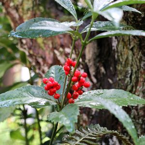 赤い実が素敵可愛い❤️おめでたい❣️ 2枚目のpic千両(センリョウ)はサツキの木の下で🌱を出しました❣️ 日陰でまだまだ小さな苗なのに健気に赤い実を付けてくれました♪ このまま大きく育ったらちょっとお邪魔虫さんになる🦆🤭 🏷️鳥さんからのプレゼント…付けさせてネ🎁 🐧さんが運んで来たみたいです^ - ^♡