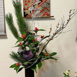 今日のお花千両 松と千両と梅?かな😅 適当に花瓶に挿してみました。 松と梅?のバランスはどうなんだろう🤔 千両はもう少し短くカットした方がメリハリが出るのかな〜🤔 なんせ一本1500円もした千両、失敗できない😅のでこれからYouTubeの生花を参考に手直し予定です。 今年もいよいよ明後日までですが、 GSでは、沢山の素敵なお花を見せていただき、又花友さんから色んなことをアドバイスいただいたり、おかげさまで楽しいGSライフを送らせていただきました。 ありがとうございました🙇♀️ 皆様、どうぞ良いお年をお迎え下さい🤗