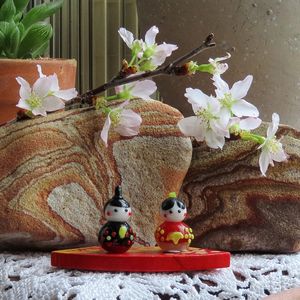 🏷️森のおひな祭り ガラス細工の小さな可愛お雛様🎎 大好きな花友さんから頂いたお雛様です♡ 2/28のお花のアレンジで使った大島桜と 私の石コレクションと 出窓のセッコクと多肉コーナーです 2024.3.3