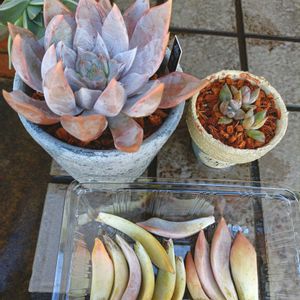 優木園さんの桃くまが子吹きして 下葉が変色してしまったので 植え替えと同時にお子達を外してみました 取った葉ははたして成長点持っているか 分からないけど葉挿しにしようと思います