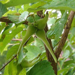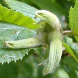 ツノハシバミ(角榛) 別名:ナガハシバミ カバノキ科ハシバミ属 の落葉低木 分布: 北海道、本州、四国、九州の丘陵地、山地 ・葉はギザギザの鋸歯が所々角のように飛び出す ・果序は1~4個が集合し、筒状の総苞が🐦のくちばしのように伸びるが特徴的で、ビッシリ毛に覆われている ⚠️この総苞の毛はトゲのように刺さることがあるらしいので要注意!…と、花友さんに教えていただきました! 毛に覆われた総苞を剥くと小さなドングリのような種子が入っており、これをペンチなどで割ると日本産のヘーゼルナッツなので、美味しいらしいですよ😋 ⚠️中の堅果を取り出す時はゴム手袋をして、毛が刺さらないように要注意ですね😅 花友さんの投稿で見たかったツノハシバミの果実にやっと逢えました♪ 次は春先の可愛い雌花序の赤い花柱を見たいですね〜🥰 📷 2023/8/21