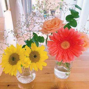 先週、花瓶に生けた花をリメイクしました🙆 このテーブルフラワーは、茎を短くしながら最後までお花を楽しむのに、ぴったりですね🥰 庭の花を足しました😉 挿し木のバラ、ブルースター、ブルーレースフラワー、ユーカリグーニー