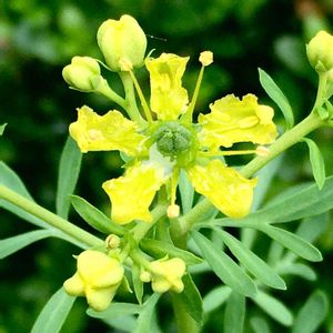 和名 ヘンルーダ(ルー) 和名なのにヘンルーダ?芸香(ウンコウ)と載っているものもありました。 ミカン科ヘンルーダ属 通りかかりの駐車場に生えていました。初めて見る花で、花弁が4枚なのでアブラナ科で検索しましたが見当たらず、 葉もレース状なので見当が付かなかったので、 夏に咲く黄色の花で片っ端から見ていって見つけました。 ミカン科なので独特の香りがあり、防虫効果や猫除けの効果もあるようでした。 ミカン科はかつてはヘンルーダ科と言っていたが日本人にとってはヘンルーダ(ラテン語)よりもミカンの方が身近なため、ミカン科と呼ぶようになったそうです。