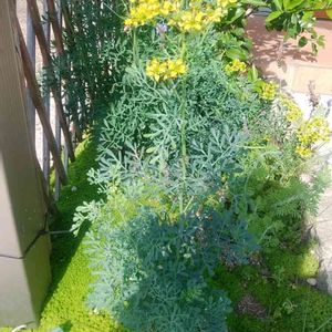 裏庭に猫さんがお土産を落としていくもので、猫が嫌う香りを探して植えました。 冬越しして2年目で綺麗な花が🌼 お土産はなくなりましたが、猫さんは相変わらず来庭。効果は気休めかなぁ😆 ところで、ヘンルーダという名前を初めて知ったのは遥か昔。クリスタルドラゴンという漫画でした😄今こうやって同じ名前のハーブを育てているのが不思議🌱✨