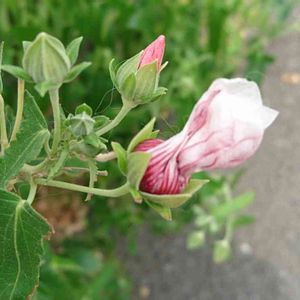 高砂芙蓉(タカサゴフヨウ)。 矢の根梵天花(ヤノネボンテンカ)とも。 コンクリートの隙間で、一見、ムクゲやフヨウのツボミによく似たとても、小さなお花を見かけました🍀蕾は1㎝位😊。 残念ながら、咲いているお花がなかったんですが、終わり花がキャンディ🍬の包みのようで可愛いくて🤗。 🔍すると、最近、gsでも見かけたタカサゴフヨウ。ムクゲによく似ていて、5㎝位の白地に真ん中が赤紫。雌しべが少し違いますが、おなじく1日花。 南米原産の帰化植物のようです🍀。南米の花なのに、梵天花(インドの花)❔と不思議だったんですが、ボンテンカと言うもっと小さな2㎝位のハイビスカスに似たお花があるようです。それに、お花が似ていて、葉っぱ🌿の形が矢の根ににているので、矢の根梵天花だそう😅なるほど👀➰😊。 台風大きそうですね😱。お気をつけ下さい。