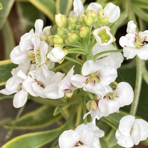 室内管理のオステオスペルマムを、いざ外に! 狭い庭、場所無し…寄せ植えかなぁ、とセンスとは無縁の寄せ植えに😹 足元を飾って貰ったのは スーパーアリッサム フロスティーナイト 今はまだバラけた花房、暖かな春の陽射しが続く様になれば… きっと、まぁるく可愛く咲いてくれる! 「旺盛、強健!栄養素スイートアリッサム」と心強い記載もあるし…ね^_^