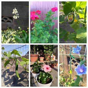 朝、取れたてのお花と野菜達です。かめ虫さん早くキユーリから離れてください(ToT)/~~~