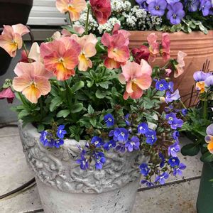 ビオラと一緒に植えていた ベロニカが咲きました🥰 可愛い〜✨ ですが、ベロニカは花がらがポトポト落ちるタイプなのだと学びました😂