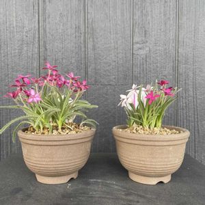 *アッツ桜* モニター報告、 鹿沼土多めでスリット鉢に植え込みました。陽当たり朝日が3時間位当たる場所です。 さくら餅さんピンクのグラデーションが綺麗です。
