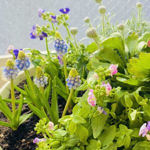 ➀➁ヒラツカスミレ白鶴がかわいく開きました♡紅ヒゴスミレもいっしょに植えたので揃って咲いてくれるといいな😊 ➂ラナンキュラスポンポン ハーマイオニー 1番花をカットし肥料あげたらつぼみがたくさん✨ ➃スイセンテータテート、最後のつぼみは双子ちゃん ➄ムスカリ、葉が出ずに花が地面から咲いてる😅 放置だった花苗、植え付けたり、クレマチス白磁ちゃんを植替えよう!とがんばっていたら強風でほこりが目に…手をすべらせ白磁ちゃん、真っ逆さま😓元気な新芽がぽきんと折れました… 花粉もつらーい😵💫