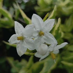 いただきものですが、その方も名前が分からず。 斑入り ツルハナナス(ヤマホロシ) で合っていますか? ② こんな白い花が咲いています。 ③ 下向きに咲きます。