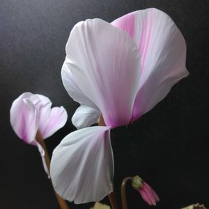 シクラメンの花びら こんな開き方? あ、まだこれから変化しますね🫧 楽しみだわ🩷 それにしても ピンクラインが面白いわ⚡ 逆光の花びらの透け感も素敵✨️✨️✨️