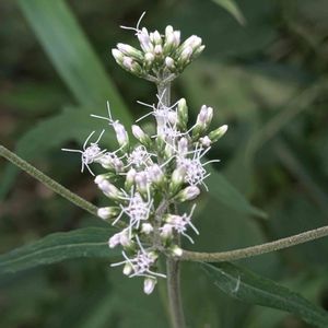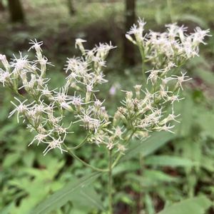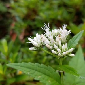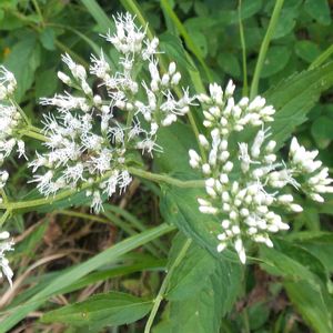 ヒヨドリバナ(鵯花)かなぁ キク目キク科フジバカマ属の多年草です。茎には紫色の斑点や短毛があります。 葉はざらざらして短柄があり、対生に付きます。 白色(稀に淡紫色)の小さな筒状花が多数集まって、散房状に咲かせます。山地の林縁に多く自生します。