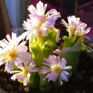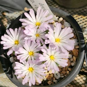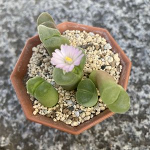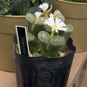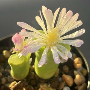ほむらさんちからやってきました。 ひときわ厳重に梱包されていた鉢をといたら、リトプソイデスが満開で出てきました🌸 思わず声を出してしまった😁 そして今日、昨年ほむらさんちから来たオフタルモが咲いたのです。 こちらは真っ白✨