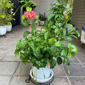 ハイビスカス 台風の為、移動。 狭い所で隣のジャカランダや、朝顔クリムソン挟まれて頑張って咲いてます。 かなり切り戻したレッドフラミンゴはまだ花はお休み中。 小さい雨と、風も少しずつ強くなって来ました。