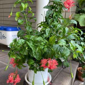 ハイビスカス🌺 左 レッドフラミンゴ 右 風鈴仏桑華 まだ蕾があります。 一段落したら切り戻して植え替えしたいと思ってます。
