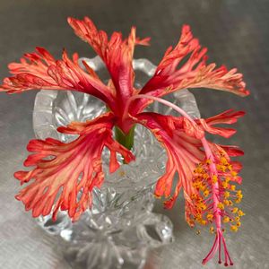 ハイビスカス🌺風鈴仏桑華 折れて落ちていたので爪楊枝立てに入れると元気になって開花しました。 ただいつもの大きさより小ぶりで半分くらいです。