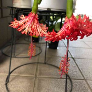 お早うございます。 今朝も可愛いハイビスカス🌺フウリンブッソウゲが咲きました。 垂れて咲くので少しでも高い場所に移動しました。