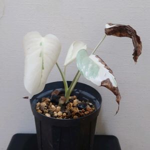 ■Monstera deliciosa var. borsigiana 'Albo' (White Tiger) 🥔 ・Monstera borsigiana 'White Tiger' モンステラ ボルシギアナ ホワイトタイガー 3つ寄せ植え(3枚目)した真っ白の子は葉がなくなってしまったので、キレイに斑が入っている子と一緒に植えてみました(1枚目)。復活するかしらん。斑がない子(2枚目)はもう斑は入らない気がするけど、元気です。