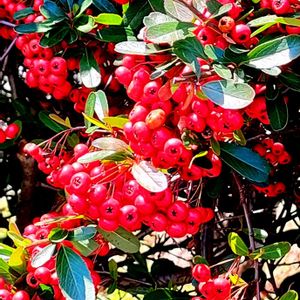 【 ピラカンサ 】 炎のような真っ赤な実を びっしりつけるピラカンサ ピラカンサの実は 野鳥さんの冬の食料に🐦️🐦⬛🐦️ 「ヒヨドリ」「ムクドリ」「ツグミ」 「メジロ」などが食べに来るそうです