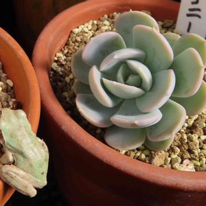 パールフォンニュルンベルグの根元で見つけたアマガエル。前回のpicのアマガエルと違って,今日のはうまく化けている。 この近くにもう一株,粉が剥がれまくっている大きな株があるけど,粉剥げはこのアマガエルの仕業?