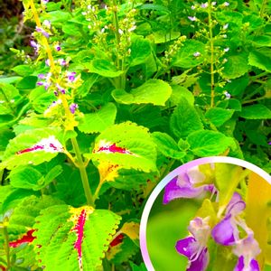 コリウス 開花 1ヶ月ほど前に紹介した栄養系コリウスとは別のコリウスになります。同じくらいのタイミングで見切り品の子をお迎えしてました。品種名等はわかりませんがこの子も小ぶりです。お花が最近咲き始めました✨️ なので実生系かな?葉っぱの斑もお花も可愛い💕 大葉はバッタに食されまくってますがコリウスはお好みでないのか被害は少ないです。 シソ科コリウス属多年草(一年草扱い) 🏷斑入りフェチ