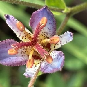 花期は 9~10月 茎先に数個の花を上向きにつける 花被片は6個 ラッパ状に開き 内面に紅紫色の斑点があります🎶 (自宅の植木鉢🪴) 台湾杜鵑(たいわんほととぎす) ユリ科