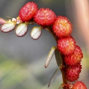 🟠🔴果実は直径3mmほどの やや扁平な球形で 多数の種子 を含み 赤く熟しましたー🎶 表面には横方向の凸凹が多い🍊 小蜜柑草(こみかんそう) 別名 キツネノチャブクロ コミカンソウ科