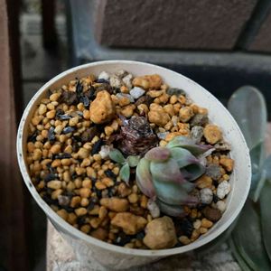 葉色が日に日に変わってきたので様子見してましたがフニャフニャになってきたので 泣く泣く取り除くと小さな芽が!(,,> <,,)♡ 変色した親株も中心は変わらず緑なのでこのまま3株で頑張ってくれるといいなぁ。 取り外した子株2個も別ポットにお引越し。