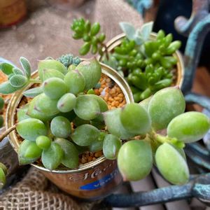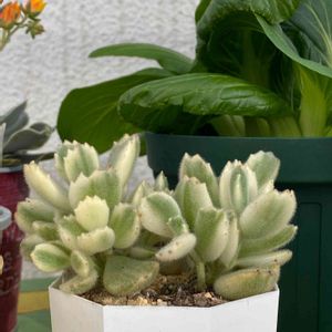 熊童子錦 🏷錦の日に参加させてください(^o^) 背後の青梗菜は買って来たものを外葉だけ食べて、真ん中の芯を植えてみた、本当に成長しました! もう食べごろです(*゚▽゚*)