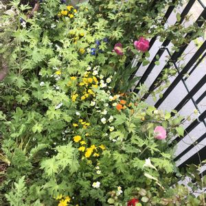 坂道花壇の全体はこんな感じです バラやクレマチスがこれから楽しみ🎶 今はラナンキュラスラックスが先揃い、カラフル