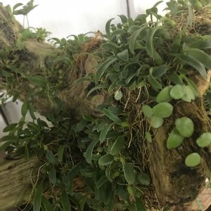 ムギラン、ミヤマムギラン、マメヅタラン 裏にカヤラン、ムカデラン、がひしめいています。 花が咲くと、黄色い花だらけになります。 流木に活着させてます。