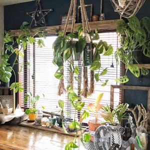 寝室出窓前の天井から吊ってるポトス、現在70cm。 葉のボリューム感が空間のアクセントにもなる、ポトスやツデーのハンギングが特に好きです♪