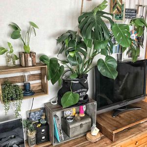 CAINZ出身の初代モンステラと ダイソー出身の三代目チビモンステラ (壁掛け木箱棚上)。 いい感じに存在感出てきました♪