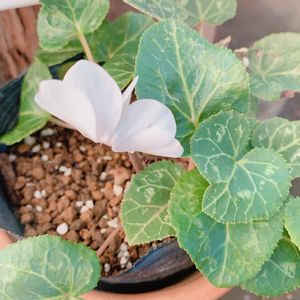 日陰で夏越し中のミニシクラメンが咲いてます😂 じつは7月にも咲いて、このお花は2つ目。 夏越しのために肥料分のない土に植え替えたのに(^:^;;)アラマァ
