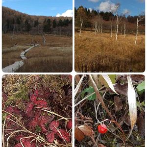 入笠湿原 秋は茶色一色ですね。 木道を歩きながら、下を見てると紅葉した葉っぱ🌿と赤い実を見つけました。 赤い実はスズランでしょうか。