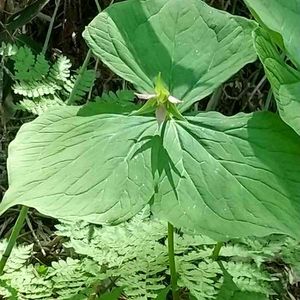 ミヤマエンレンソウ 山地の日陰に大きな3枚の葉。 可愛い3弁の花が上向きに咲いてます。