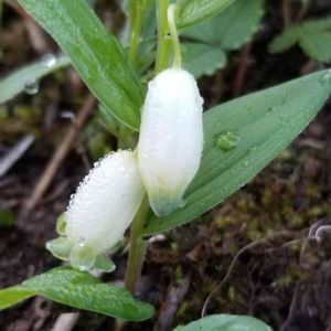 アマドコロ「甘野老」(キジカクシ科)名は、根茎がヤマノイモ科のオニドコロ(トコロ)に似ていて食べると甘いことからついたもの。 朝露がびっしりついて…