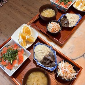 朝ごはん 紅鮭スライスちらし寿司、大葉千切 淡竹絹皮味噌汁 大根、人参、落花生なます 蒟蒻だし煮、ぬた 河内晩柑