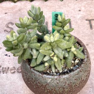 こちらも、盆栽鉢に植えた… デロスペルマ属の「雷童錦」です。 先月も投稿してましたが、1か月で案外成長していますね? 12月はわりと緑色でしたが、最近日照時間が長くなってきたからなのか、少し黄色っぽくなってきたような。 私、木立多肉を盆栽風に植えるのがとっても好きなんですよね… 過去の様子は 🏷はなずきん雷童錦 で見られます。