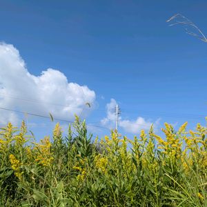 お墓参りの帰り道🤳☁️🟦🟡 秋空とセイダカアワダチソウ🟡 夏に草刈りされて背は低いけれどね🤭🤣
