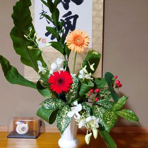 フラワーアレンジメントのグリーンとデンファレが残っているのでガーベラとヒペリカムを加えて仕立て直しました😉