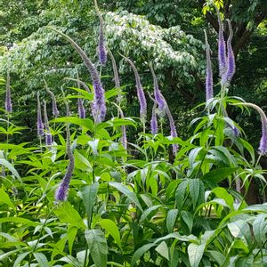 エゾクガイソウ🌿 ライラックの木の下でひっそりと 1人で イヤイヤ 1本で咲いてます🌿 うしろで紫陽花コンビが覗いてますね🤭