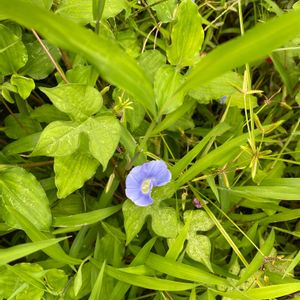 アメリカ朝顔🟦🟪 御用水土手 花3、4㌢ これは雑草‥かな🌱🌱 うちの裏フェンスにも蔓を絡めて🩵薄い水色のが沢山咲いてます♪♪小さいことはかわいいこと⁈😆