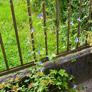 🟦アメリカあさがお 裏庭フェンス 今年も勝手に咲き始めました🎵♡ 3㌢のかわいい子、、雑草は強いわー🤭