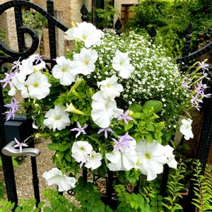植え込んで約ひと月、いい感じになってきました。 5/22の投稿ではペチュニアばかりが目立っていたけど、イソトマの薄紫が優しく寄り添っています💜🤍💚 昨晩からの雨に備えて、門扉から外して避難させました☔️