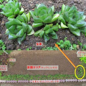 キュウリ、アサガオをすべて撤去してスッキリした小さな菜園。 その周りには、タニクがすっかり定着。 特に 冬越えで傷んだ宝草は、ここにきて、元気にグリーンの太っ葉を見せてくれてまーす。