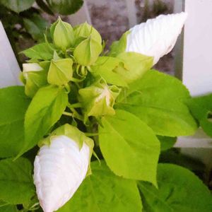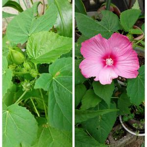 花友さんがくれた小さな苗…蕾が開きました😃!アメリカ芙蓉でしょうか?花びらが虫に食べられた!😓