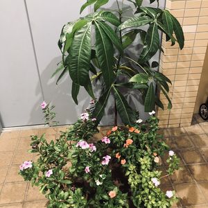 育成四年目のmyパキラ、水遣り前で葉が垂れています😆 手前向かって左はやはり4年目!のニチニチボク、本来は一年草の(日々草ビンカ)です。 幹直径2㎝近い大株?です。更に真ん中、右側、その後ろのも3年物のニチニチボクです😼 さて身長7㎝埴輪くんはどこに? 10/16撮影