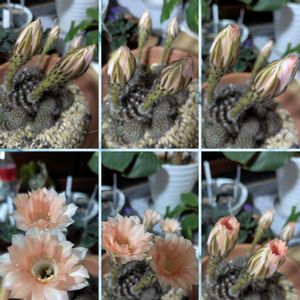 サボテン🌵エキノプシス🧡🩷 昨夜7時頃から開花を始め午前2時迄 観察してみました😊 朝6時に起床するとパカンと開いていました🥰 左上から順に見て下さいね💖🌵